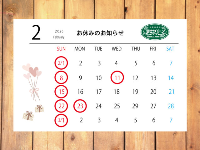 本年も当店をご愛顧いただき誠にありがとうございます。富士グリーンは誠に勝手ながら12月31日(水)~1月4日(日)の間年末年始休業とさせていただきます。2026年も自然食品…