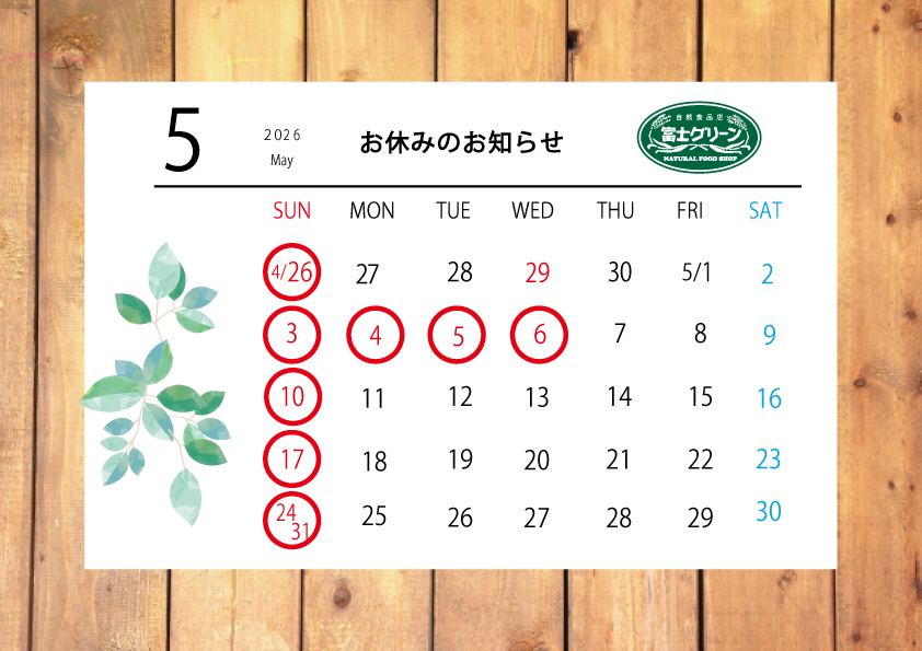 2026年5月 営業日のお知らせ